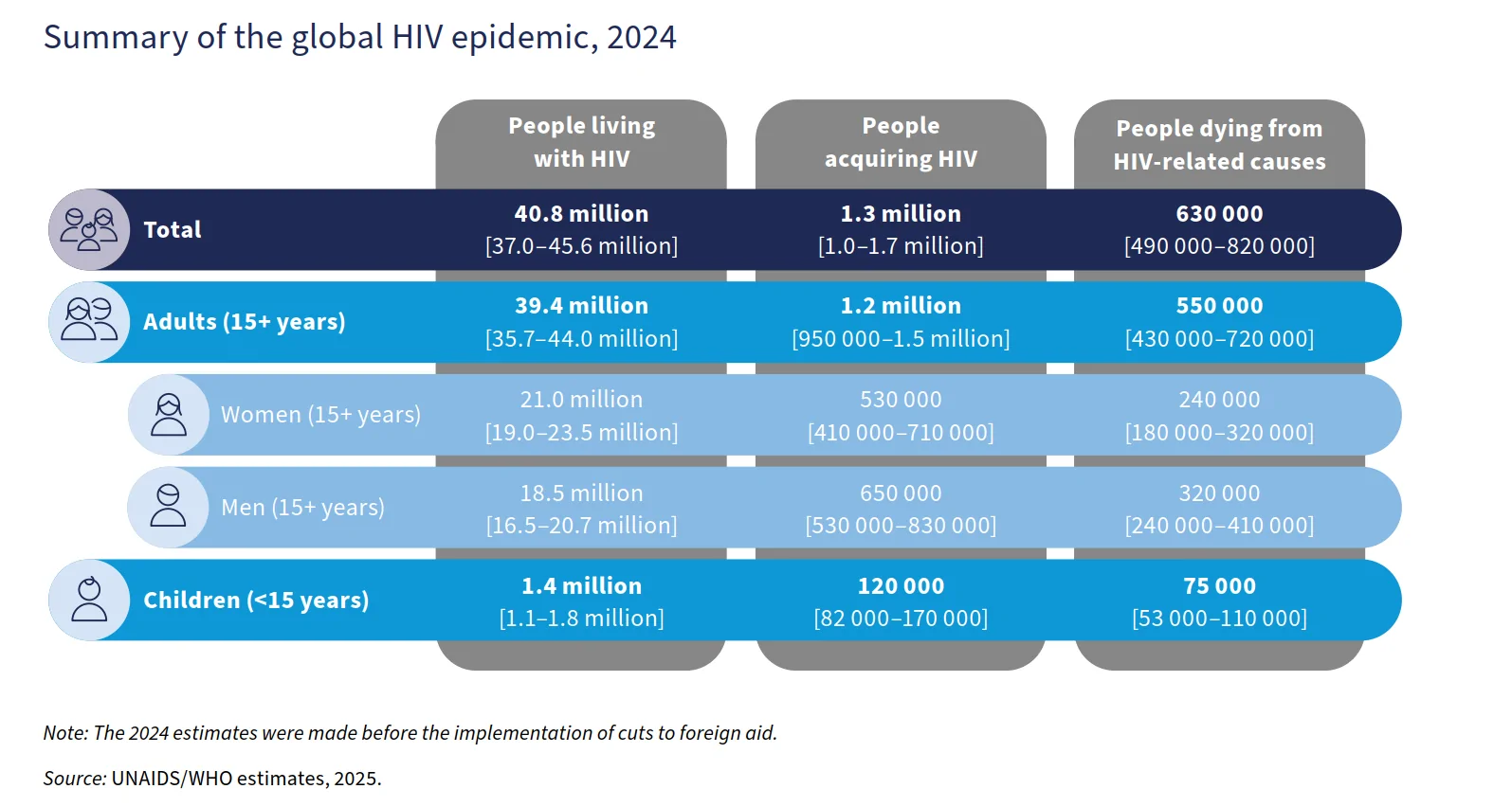The global HIV response in 2024 reflects decades of progress but also highlights troubling gaps that threaten the path toward ending AIDS as a public health threat by 2030. Despite major achievements in prevention, treatment, and long-term survival, the world remains off-track to meet the essential targets set for 2025. An estimated 40.8 million people are living with HIV, and although infection and mortality rates have declined significantly over time, they remain unacceptably high.